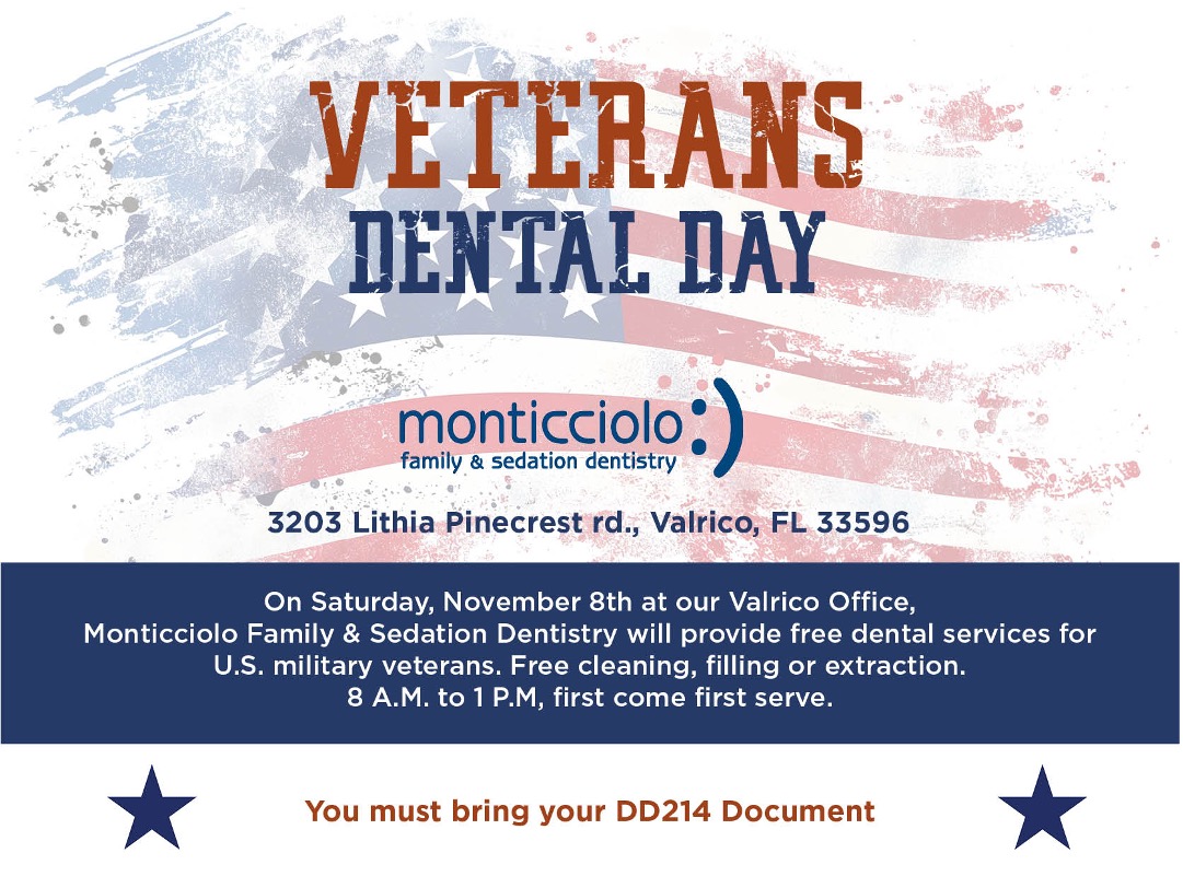 This Veterans Day, Monticciolo Family & Sedation Dentistry is proud to open our doors to those who have served our country. As a heartfelt thank-you for your service, we are offering FREE dental care for Veterans, including a cleaning, filling, or extraction — no cost, no catch, just gratitude.